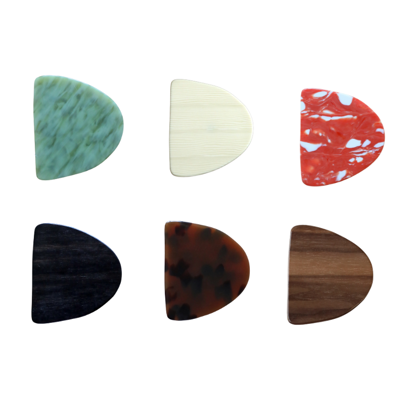 Ce bouton en reprend l’esprit à travers sa silhouette semi-circulaire adoucie. Sa ligne arrondie se déploie avec douceur, tandis que son côté droit, plus structuré, offre un contraste subtil qui évoque l’alliance de spontanéité et de maîtrise chère à l’artiste. L’ensemble crée un équilibre poétique : une forme simple, mais pleine de mouvement et de personnalité.