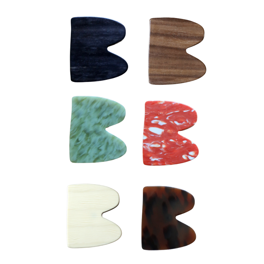 Son design se distingue par une silhouette douce, arrondie, presque comme dessinée d’un geste spontané. Cette forme libre évoque les contours biomorphiques chers à l’artiste : ni totalement géométrique, ni complètement organique, mais un équilibre subtil entre les deux. Les courbes s’enchaînent et créent un volume fluide qui capte la lumière différemment selon l’angle, donnant au bouton une présence presque vivante.